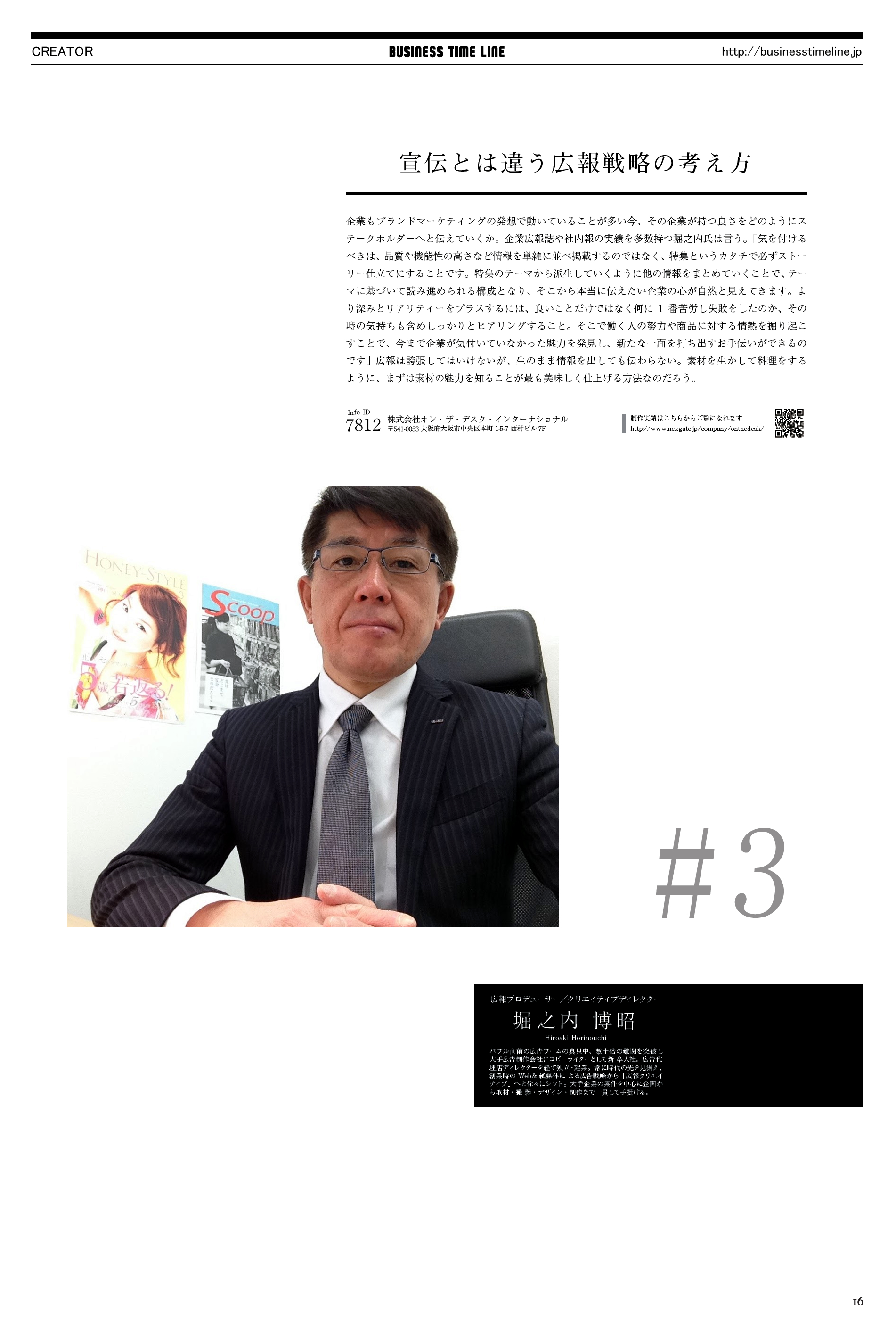 当社代表取締役・堀之内博昭が、クリエイティブ経済誌「BUSINESS TIMELINE」第16号(2016年10月31日発行)のCREATOR欄で紹介されました。