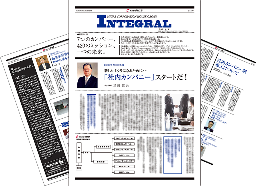 2011.06.01 株式会社ミウラ様 社内報「INTEGRAL」新創刊号(通刊第130号)発行しました 最新事例 株式会社ミウラ社内報「INTEGRAL」新創刊号(通刊第130号)企画・ネーミング・編集・デザイン・制作・印刷