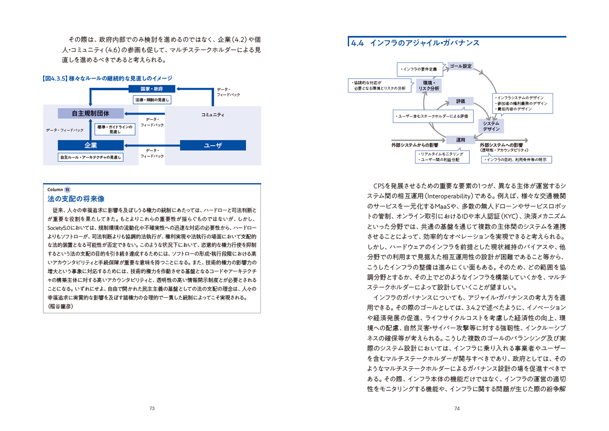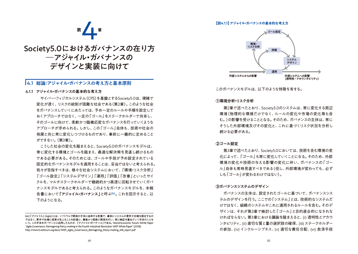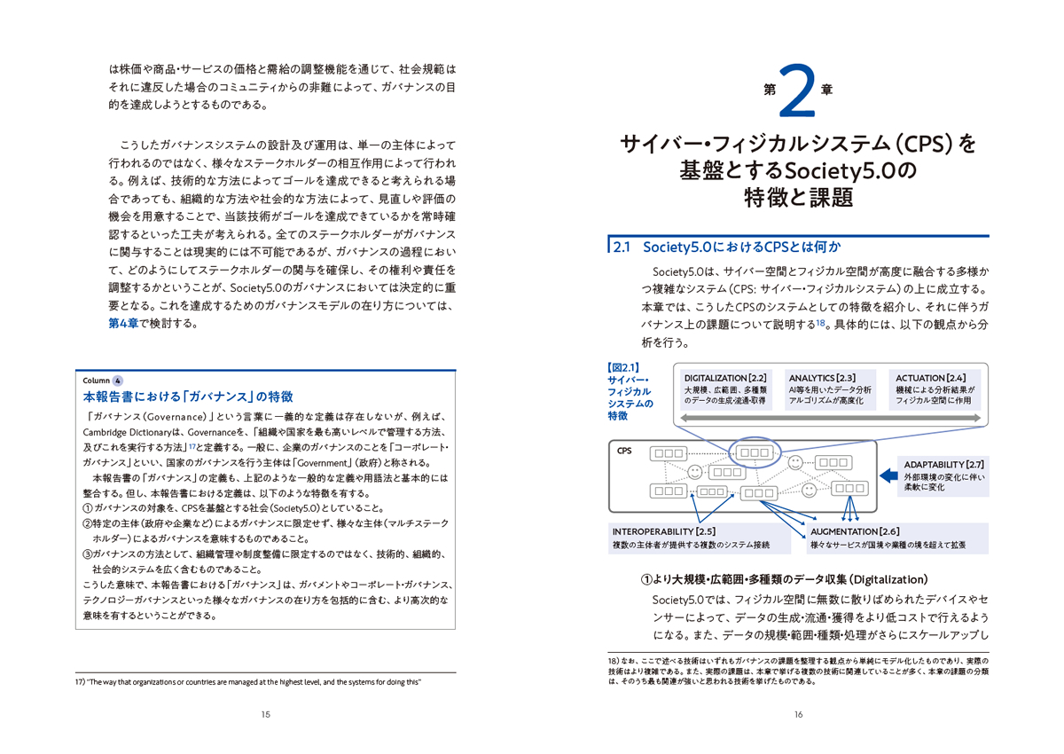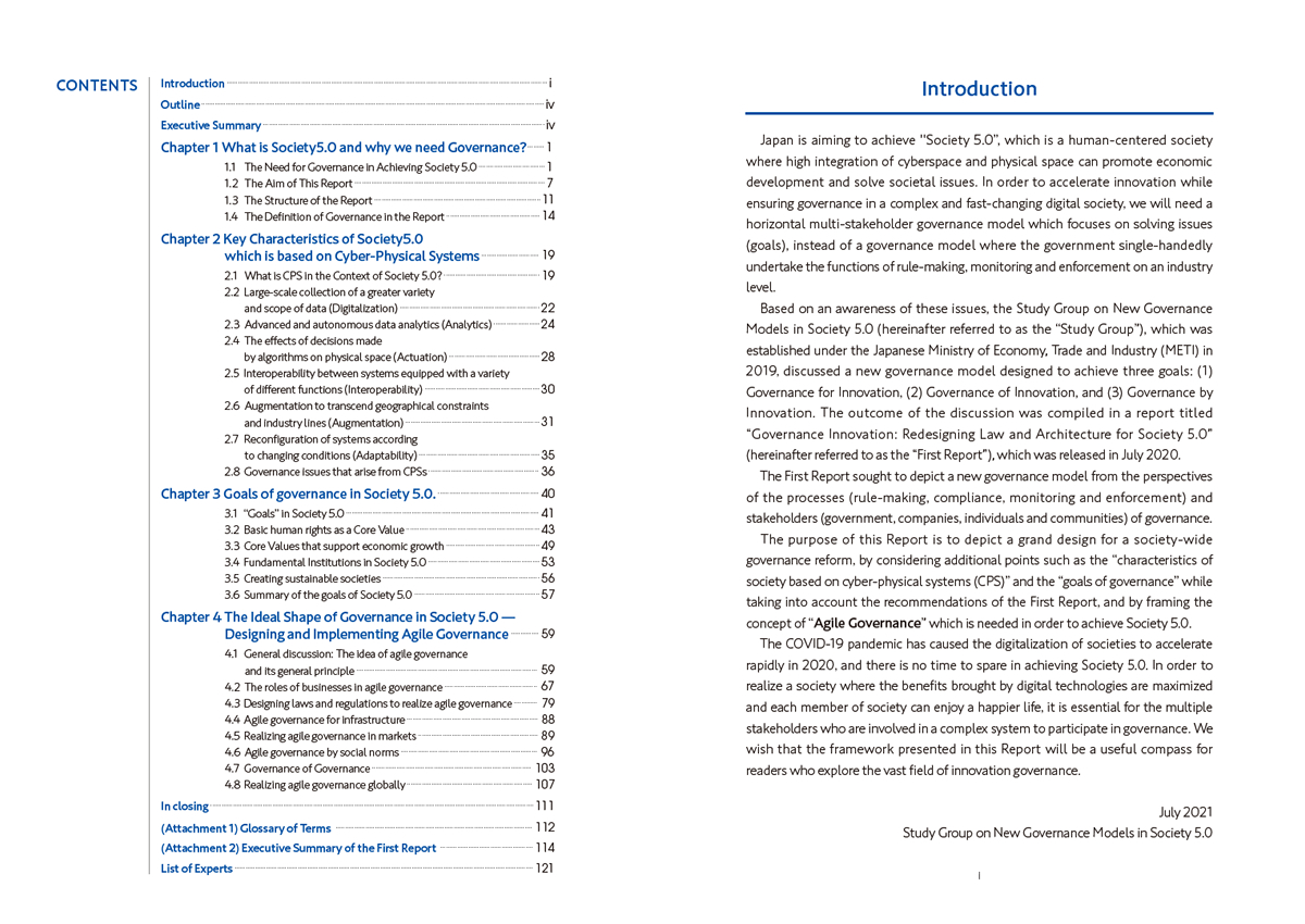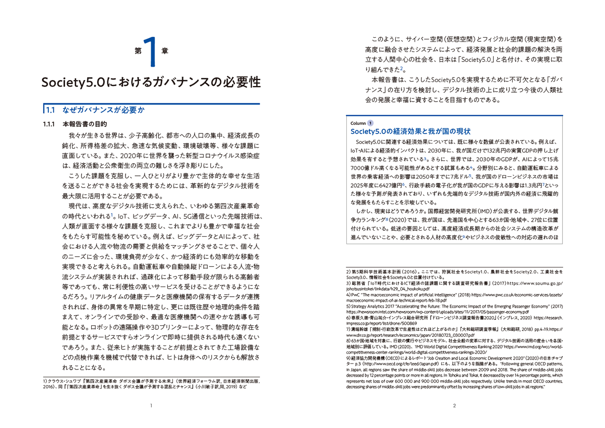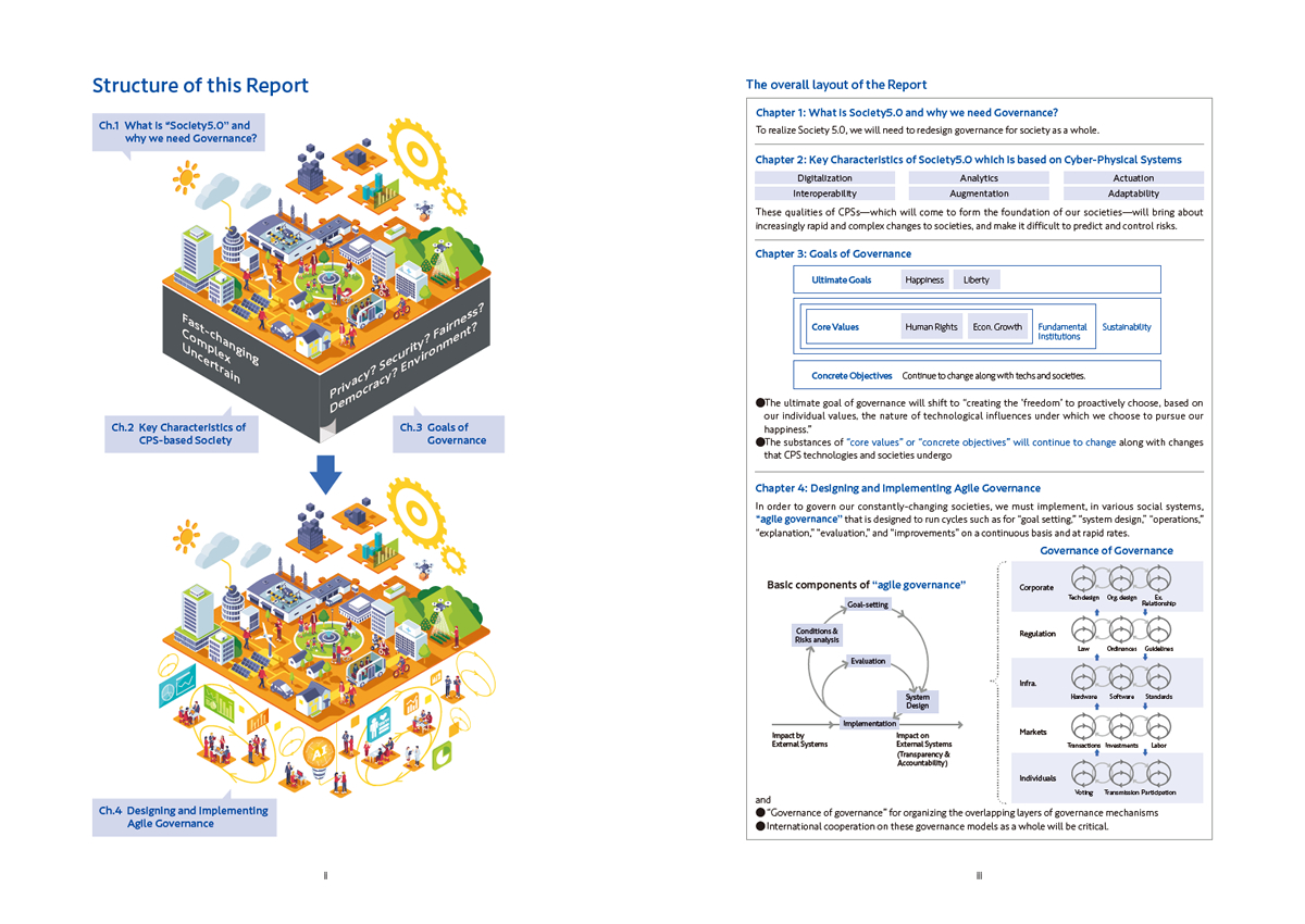 2020年に「ガバナンス・イノベーション」のタイトルで初めて発行された同報告書の2021年度最新版として、特に前年世界を襲った新型コロナウイルス感染症により浮き彫りとなった経済活動と公衆衛生の両立の難しさを背景に、サイバー空間(仮想空間)とフィジカル空間(現実空間)を高度に融合させたシステムによる経済的発展と社会的課題の解決を両立する人間中心の社会(Society 5.0)の実現への最新の取り組みを報告。